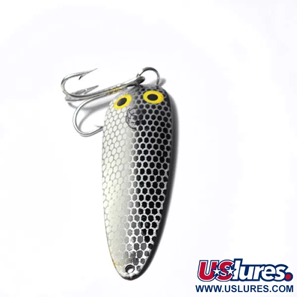Con un peso de 28 g (1 oz), esta robusta cucharilla ondulante es un ejemplo clásico de la historia del material de pesca estadounidense. El cuerpo de 9 cm (3 1/2") presenta un acabado plateado con un patrón de panal negro y dos distintivos ojos amarillos, conocido como esquema de color Natural. En el reverso, el profundo estampado "DARDEVLE DETROIT USA" identifica su fabricación por Eppinger antes de su traslado a Dearborn en 1959. Este ejemplar, identificado con el código de producto 0243, se encuentra en un estado 5/5 y muestra la forma cóncava específica lograda mediante los moldes patentados del fabricante. El montaje consta de un robusto anzuelo triple asegurado por una anilla abierta de alta resistencia. Esta construcción de metal de gran calibre está diseñada para facilitar lances a larga distancia y permitir que el señuelo mantenga la profundidad durante una recogida constante, produciendo una acción de bamboleo uniforme.
