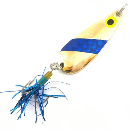 Con un peso de 10g (1/3oz), esta cucharilla ondulante Lindy Finsel presenta un acabado clásico bañado en oro acentuado por una vibrante franja holográfica azul. Con una longitud de 5,5cm (2 1/4"), su cuerpo en forma de lágrima es un sello distintivo de la tradición de fabricación de Lindy / Little Joe. Este ejemplar específico, identificado con el código de producto 4530, tiene un ojo amarillo pintado con pupila negra situado cerca del anilla superior. El montaje terminal consiste en un anzuelo triple afilado adornado con tinsel azul brillante, sujeto por un collar bicolor turquesa y dorado. Fabricado en USA, el cuerpo metálico refleja las técnicas de chapado de alta calidad utilizadas por Lindy-Little Joe durante esta época. Su estado está calificado como 4/5, mostrando una superficie limpia y bien conservada que mantiene su brillo original tanto en el metal como en la cinta decorativa. Una marca grabada se encuentra en el lado cóncavo interior del señuelo, asegurando su autenticidad para los coleccionistas.
