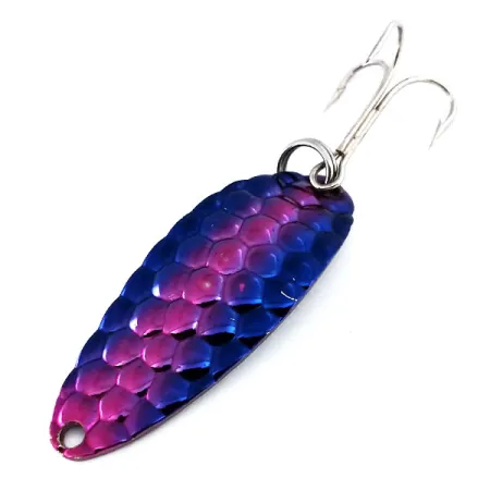 Con un peso de 9g (1/3oz), esta cucharilla ondulante de fabricación estadounidense presenta un distintivo perfil de cuerpo ancho diseñado para el lance. La superficie frontal muestra un patrón de escamas hexagonales con un degradado en púrpura y azul profundo, mientras que el reverso es de níquel pulido impecable. Con una longitud de 4,5 cm (1 3/4"), esta Acme Little Cleo está catalogada con el código de producto 10271 y se encuentra en un estado impecable de 5/5. El montaje incluye una anilla abierta de fábrica y un anzuelo triple afilado, ambos sin signos de desgaste. Su cuerpo de acero estampado cuenta con un orificio de sujeción en el extremo estrecho y un enganche para el anzuelo en la cola más ancha. El orificio troquelado en el borde delantero está perfectamente acabado para una conexión directa con la línea o un esmerillón.