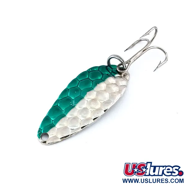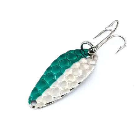 Con un peso de 7 g (1/4 oz), la distintiva textura martillada de esta cucharilla ondulante proporciona reflejos polifacéticos diseñados para atraer a los depredadores bajo diversas condiciones de luz. Con una longitud de 4 cm (1 1/2"), la Acme Little Cleo (código: 10279) se presenta en un llamativo color Hammered Nickel / Green, con pintura verde vibrante en la mitad de la cara y la base de níquel brillante en la otra. Su exclusiva forma encorvada es un sello de la fabricación estadounidense de Acme, diseñada específicamente para lances largos y curricán. El montaje incluye una anilla abierta robusta conectada a un anzuelo triple afilado con acabado plateado. Calificada con 5/5, el señuelo está excepcionalmente bien conservado, manteniendo un brillo intenso tanto en el frontal martillado como en el reverso liso.