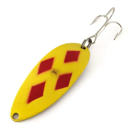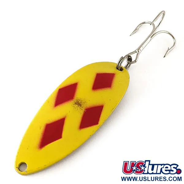 Cinco diamantes rojos sobre un fondo amarillo vibrante definen el acabado icónico de esta cucharilla ondulante de 11 g (2/5 oz). Estampada claramente en el reverso metálico con el nombre "LITTLE CLEO ®" y el peso, este señuelo de Acme es un excelente ejemplo de equipo fabricado en USA. Con una longitud de 5,5 cm (2 1/4"), el distintivo perfil con joroba de la cucharilla está equilibrado tanto para lance como para curricán. El herraje original permanece intacto, con un anzuelo triple plateado unido mediante una robusta anilla abierta. Para un coleccionista, la calificación de estado 5/5 es evidente en su acabado brillante, aunque se aprecia una pequeña marca de tiempo cerca del patrón central. Identificado con el código 12330, este modelo luce una paleta de colores clásica, fundamental para la pesca de lucio y grandes truchas. La superficie posterior mantiene un aspecto pulido que genera destellos significativos bajo el agua.