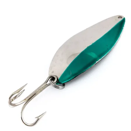 Dividido verticalmente por la mitad, el acabado de esta pesada cucharilla ondulante combina un níquel de alto brillo con una vibrante franja verde. Con un peso de 35g (1 1/4 oz), esta Acme Little Cleo, catalogada con el código 9827, está diseñada para lanzamientos a larga distancia o para alcanzar capas térmicas profundas durante el curricán. El cuerpo de latón de 8cm (3 1/4") presenta el característico perfil jorobado que ha convertido a este señuelo fabricado en EE. UU. en un elemento básico para los pescadores de salmón y steelhead durante generaciones. En el reverso, el nombre "LITTLE CLEO" está claramente grabado en el metal. Este ejemplar se encuentra en un estado excelente 5/5, mostrando una superficie brillante y reflectante. Está equipada con un fuerte anzuelo triple sujeto por una anilla abierta de alta resistencia, y la parte delantera está perforada limpiamente para un clip o enganche directo.