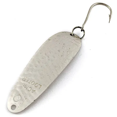 La textura de plata martillada en su cuerpo de 1/8 oz (4 g) crea una superficie reflectante polifacética diseñada para captar la luz de manera eficaz durante el curricán. Identificada con el código de producto 20485, esta Acme Looter de 2 1/4" (6 cm) es una cucharilla especializada que muestra la sencillez de la metalurgia estadounidense vintage. El reverso es liso y presenta el nombre del fabricante y del modelo claramente troquelados, encontrándose la pieza en un excelente estado de conservación 5/5. Un anzuelo simple va unido al cuerpo en forma de lágrima mediante una resistente anilla abierta en la cola, mientras que la cabeza cuenta con un orificio de sujeción perforado con precisión.