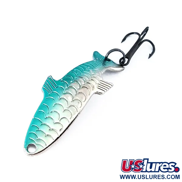 Con un peso exacto de 4 g (1/8 oz), esta cucharilla ondulante presenta un detallado patrón de escamas con un degradado que va desde un intenso azul cerceta en el lomo hasta un acabado de níquel brillante. Esta Acme Phoebe fabricada en EE. UU., identificada con el código de producto 10352, mide 4 cm (1 1/2") y cuenta con una silueta de pez bien definida con agallas y aletas estampadas para realzar su perfil tridimensional. El reverso es de níquel pulido y lleva grabados los nombres de la marca Acme y del modelo Phoebe. Equipada con poteras originales de acabado oscuro y una anilla abierta resistente, los componentes están en excelente estado. Con una calificación de estado 6, el señuelo está sin usar y mantiene el mismo brillo que al salir de fábrica. Su forma hidrodinámica específica está diseñada para ofrecer versatilidad, permitiendo pescar con eficacia a diferentes profundidades.