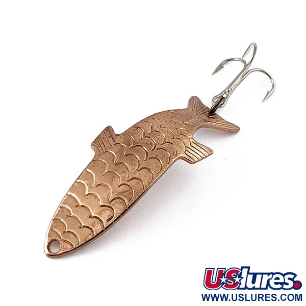 Con un peso de 1/4 oz (7 g), esta clásica cucharilla presenta un patrón de escamas profundamente grabado que crea un marcado efecto tridimensional. Fabricado por Acme en EE. UU., el señuelo lleva el nombre "PHOEBE" estampado con claridad en su reverso liso. El acabado en cobre sólido mantiene su brillo a lo largo de sus 2" (5 cm) de longitud, con una valoración de estado 5/5 por su superficie impecable y la ausencia de desgaste visible. Identificado con el código de producto 17793, el cuerpo metálico tiene la forma de un perfil de pez realista con aletas definidas y una cola curva. Un robusto anzuelo triple está sujeto a la parte trasera mediante una anilla abierta, mientras que en el morro se sitúa un único orificio para el sedal. Su diseño hidrodinámico está pensado para un uso versátil, ofreciendo un rendimiento fiable tanto en recogidas lentas en zonas poco profundas como en lances a mayor profundidad.