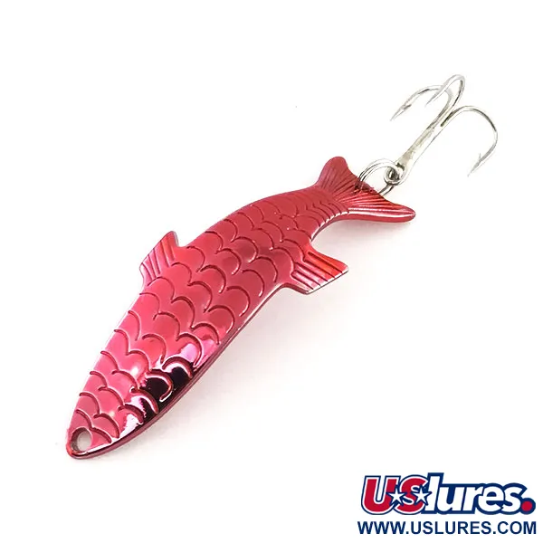 Un revestimiento Pink Metallic cubre el cuerpo de metal troquelado de esta clásica Acme Phoebe, un diseño que ha sido un pilar para los pescadores en todo EE. UU. Con una medida de 2" (5 cm) y un peso de 1/4oz (7 g), este señuelo lleva el código de producto 9153. La superficie frontal se caracteriza por un detallado patrón de escamas y aletas en relieve, lo que crea una ilusión tridimensional al ser recuperado por el agua. Su forma hidrodinámica única está diseñada para funcionar a varias profundidades, ya sea trabajado rápido sobre zonas poco profundas o más lentamente en pozas profundas. En el reverso, el nombre auténtico del fabricante está claramente troquelado en el acabado pulido. Con una calificación de 5/5, el acabado es excepcionalmente limpio, manteniendo su calidad reflectante de alto brillo en todo el perfil. El hardware consiste en una anilla abierta de plata brillante y un afilado anzuelo triple sujeto a la cola.