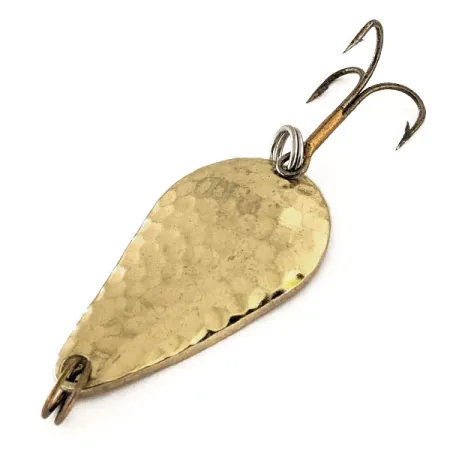 La textura de oro martillado en la superficie convexa proporciona el principal atractivo visual de esta cucharilla de 14g (1/2oz). Con una longitud de 4,5 cm (1 3/4"), la Acme Stee-Lee lleva su identidad claramente grabada en el metal liso de la cara interior. Este ejemplar, identificado con el código de producto 11370, tiene una calificación de estado de 4/5, ya que muestra una superficie reflectante brillante en el lado martillado y un ligero oscurecimiento por el paso del tiempo en las superficies más planas. Fabricado en EE. UU., el señuelo está equipado con robustas anillas abiertas en ambos extremos y su anzuelo triple bronceado original. La forma de lágrima es un sello distintivo de esta serie, diseñada para lograr distancias de lanzado eficaces a varias profundidades. La marca grabada permanece nítida y totalmente legible sobre el acabado dorado.