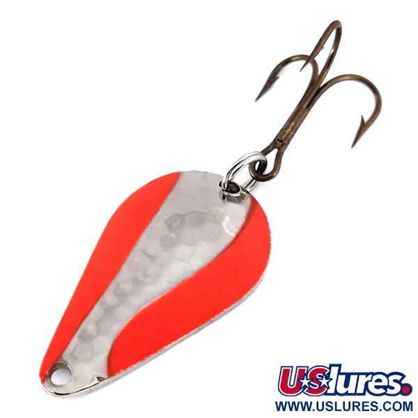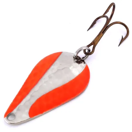 Un cuerpo niquelado combinado con rayas naranjas fluorescentes define el perfil visual de esta Acme Stee-Lee UV de 4,5 cm (1 3/4"). Con un peso de 14 g (1/2 oz), la cucharilla presenta una sutil textura martilleada en su superficie metálica, que interactúa con el pigmento de alta visibilidad. Bajo la luz ultravioleta, las bandas naranjas pasan a un brillo rojo anaranjado luminoso, una característica técnica utilizada para la visibilidad en aguas profundas o condiciones de poca luz. Este ejemplar, con código de producto 10371, está sin usar con una calificación de estado de 6. El equipo consta de un anzuelo triple bronceado unido mediante una anilla abierta, lo que refleja los estándares de fabricación de alta resistencia del fabricante. Un orificio para el sedal está limpiamente perforado en el extremo estrecho de la hoja en forma de lágrima para adaptarse a varias configuraciones de nudos o clips.