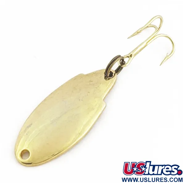 En el reverso aparece claramente estampada la identificación «ACME THUNDERBOLT 1/10 OZ.», lo que aporta carácter a esta cucharilla de 3,5 g (1/8 oz). El baño de oro pulido mantiene un brillo excepcional en todo el cuerpo de 3 cm (1 1/4"), lo que le otorga una calificación de estado 5/5. El acabado (Código 24557) no muestra signos de descascarillado ni pérdida de lustre. El morro estrecho conduce a un único punto de sujeción, mientras que la cola más ancha sostiene una potera con un acabado dorado a juego. Todas las letras estampadas son profundas y legibles sobre la superficie metálica lisa.