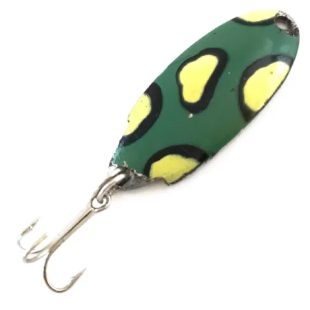 Grabado claramente en el metal del reverso niquelado se encuentra el nombre "THUNDERBOLT", que identifica a esta clásica cucharilla ondulante de fabricación estadounidense. Adornada con el tradicional patrón Frog, la cara del señuelo muestra una base de color verde oscuro con motas amarillas perfiladas en negro. Con una medida de 4 cm (1 1/2") y un peso de 5 g (3/16 oz), este ejemplar lleva el código de producto 5242 y refleja la historia de Acme Tackle Company en la fabricación de piezas metálicas fiables. Su estado es de 3/5, mostrando algunas ligeras pérdidas de pintura y un envejecimiento auténtico en las superficies niqueladas que los coleccionistas suelen valorar. Su diseño de lágrima, sencillo y eficaz, cuenta con una anilla original y una potera de acero. Las letras "THUNDERBOLT" permanecen nítidas y legibles, contrastando con el metal texturizado de la panza de la cucharilla.