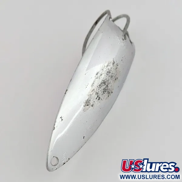 Grabadas claramente en la parte inferior de la cucharilla se encuentran las palabras "ACME WEEDLESS MINNOW", testimonio de un diseño patentado en 1951. La parte operativa cuenta con un mecanismo único de triple anzuelo diseñado para ser antialgas hasta que el pez ataca, momento en el que se despliegan los anzuelos. Reluciente con un acabado cromado clásico, este ejemplar muestra pequeñas marcas superficiales de su paso por la caja de aparejos, con una calificación de estado de 4/5. Con una longitud de 3" (7,5 cm) y un peso de 3/4 oz (24 g), es lo suficientemente pesada para lanzados largos y precisos en vegetación densa o nenúfares. La curva interior también lleva la marca "PAT. PENDING", situándola en los inicios de la historia de fabricación de este clásico estadounidense. Para mejores resultados, los pescadores veteranos la recogen lentamente entre la maleza o aumentan el ritmo en claros de agua abierta.