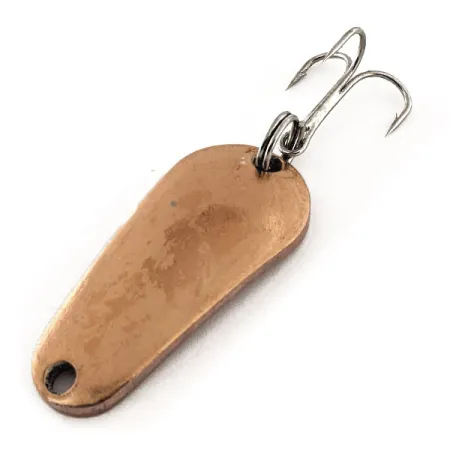Un acabado de cobre cálido define esta clásica cucharilla americana, que refleja la luz con el suave brillo típico de los señuelos metálicos vintage. Producido por la empresa Aeroplane Spinner en los EE. UU., este modelo Aero (Código de producto: 11796) representa una época de diseño de equipo sencillo y eficaz. Con un peso de 7 g (1/4 oz) y una longitud de 3,7 cm (1 1/2"), su perfil de lágrima está estampado con una curvatura sutil para interactuar con la resistencia del agua. El ejemplar está sin usar y se mantiene en un estado 5/5, mostrando una superficie limpia y sin desgaste. Incluye una anilla abierta plateada y un anzuelo triple afilado, que contrastan perfectamente con el tono cobrizo rojizo del cuerpo.