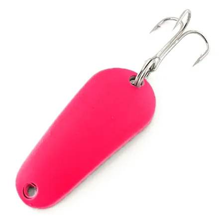 Con una medida compacta de 3,7 cm (1 1/2"), el cuerpo en forma de lágrima de esta cucharilla Aero tiene un acabado en rosa fluorescente de alta visibilidad. Bajo la luz ultravioleta, el revestimiento reactivo a los UV emite un resplandor rojo intenso, diseñado para ser visible en condiciones de poca luz. Un anzuelo triple afilado está unido mediante una anilla abierta al extremo más ancho del metal estampado, mientras que un ojal de enganche limpio se sitúa en la punta afilada. Este ejemplar, identificado con el código de producto 12051, procede de EE. UU. y mantiene un estado 5/5 con una superficie vibrante y uniforme. Con un peso de 7 g (1/4 oz), el señuelo está fabricado para diversas técnicas de lanzado y jigging vertical. La empresa Aeroplane Spinner utilizó esta pintura fluorescente específica para realzar el perfil de sus señuelos clásicos de la serie 'Aero'.