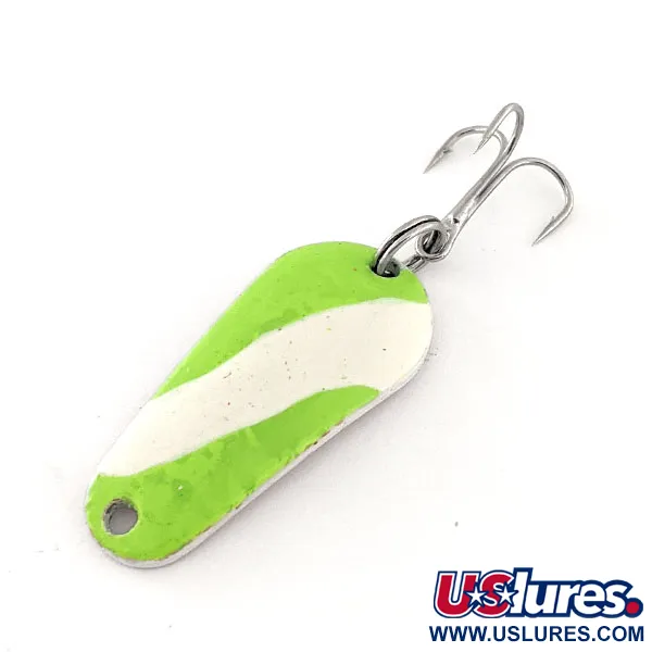 Con un peso de 1/4oz (7g), esta pieza de la historia del tackle estadounidense destaca por su distintiva textura martillada en su cuerpo metálico. Fabricada por Aeroplane Spinner y denominada Aero UV, esta cucharilla de 1 1/2" (3,7cm) está equipada con un anzuelo triple afilado y una anilla abierta resistente en la cola. El esquema de color consiste en bandas diagonales alternas de verde fluorescente y blanco aplicadas sobre una base de cobre. Aunque parece un señuelo brillante estándar a plena luz, el tipo "UV Glow" se refiere a su capacidad de brillar bajo luz ultravioleta, lo que la hace muy visible en aguas profundas o turbias. Con una calificación de 5/5, el señuelo está en excelente estado, manteniendo sus colores vibrantes y herrajes limpios. Con el código de producto 11529, representa un tamaño versátil para diversas especies de agua dulce. Un pequeño orificio de sujeción está perforado con precisión en el extremo estrecho para el clip o bajo de línea.