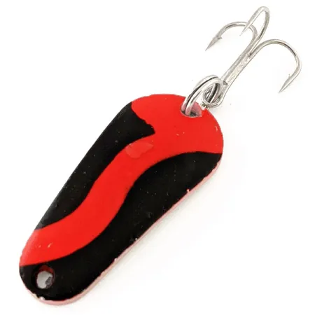 Con un atrevido patrón de ondas negras y rojas sobre una base dorada, este ejemplar exhibe la estética clásica de Aeroplane Spinner. Fabricada en USA, la Aero UV cuenta con un revestimiento fluorescente especializado que reacciona intensamente bajo la luz ultravioleta. Con un peso versátil de 7 g (1/4 oz) y una longitud de 3,7 cm (1 1/2"), presenta un perfil de lanzado estándar para diversas especies de agua dulce. El anzuelo triple está sujeto de forma segura mediante una anilla abierta robusta, garantizando una resistencia óptima. Este espécimen, catalogado bajo el código 12055, mantiene una calificación de estado 5/5, con un acabado impecable y colores brillantes. El contraste entre el negro profundo y la franja rojo-naranja brillante proporciona una firma visual única para entornos de poca luz.