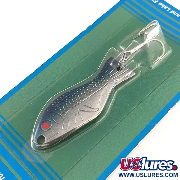 Un baño de níquel combinado con un lomo azul neón define la estética de esta cucharilla ondulante vintage de 7 g (1/4 oz). Agallas estampadas y un patrón de escamas texturizado envuelven el cuerpo de latón de 5 cm (2"), que cuenta con un único punto rojo cerca de la punta para aportar contraste. Este ejemplar, identificado con el código 11524, está sin usar y se conserva en su embalaje original. Está fabricado con latón marino de calidad estadounidense, equipado con anillas abiertas de acero inoxidable y un anzuelo niquelado extra afilado diseñado tanto para lanzado como para cacea. Históricamente, este diseño data de 1952 y fue reconocido por la revista Field and Stream como uno de los 50 mejores señuelos de todos los tiempos debido a su eficacia con especies que van desde truchas y salmones hasta percas y black bass. El envase destaca que el señuelo produce una acción de balanceo y destellos al ser recuperado.
