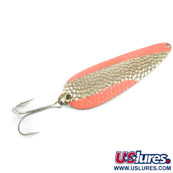 Los acabados en oro martillado y naranja vibrante crean un contraste visual impactante en la cara de este señuelo, catalogado con el código 2452. Con un peso de 21 g (3/4 oz) y una longitud de 9 cm (3 1/2"), la cucharilla presenta una textura profundamente martillada diseñada para captar y reflejar la luz en toda su superficie. El reverso revela un acabado dorado liso y pulido, claramente estampado con "AQUA SPOON MADE IN USA", lo que resalta su herencia de fabricación Nebco. Este señuelo se encuentra en un estado 5/5, mostrando un brillo metálico limpio y una pintura bien conservada en los bordes exteriores. Un anzuelo triple de alta resistencia está fijado de forma segura mediante una robusta anilla de latón en la cola, mientras que la parte delantera está perforada para el atado directo de la línea. Diseñada para el lance tradicional o el curricán, la forma de lágrima y el peso sustancial de la cucharilla proporcionan la densidad necesaria para alcanzar distancia y gestionar la profundidad en aguas abiertas.