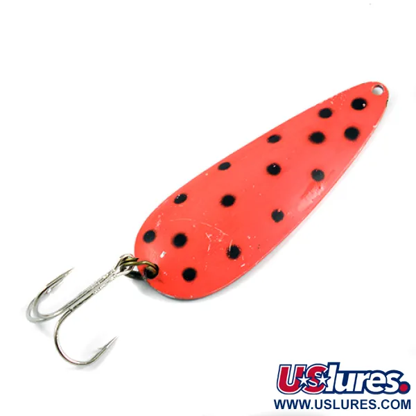 Con una longitud de 9 cm (3 1/2"), el distintivo perfil alargado de este ejemplar destaca por su cara roja vibrante y sus puntos negros en contraste. Catalogada con el código de producto 2459, la cucharilla ondulante presenta un reverso de níquel pulido donde los sellos "AQUA SPOON" y "MADE IN USA" son claramente visibles en el metal. El peso de 21 g (3/4 oz) sugiere un señuelo fabricado para alcanzar grandes distancias de lanzado o mantener la profundidad durante el curricán de lucios o grandes truchas. En cuanto a su estado físico, el señuelo muestra evidencias mínimas de uso previo, con una calificación de 4/5. El anzuelo triple original está unido mediante una anilla abierta reforzada, y la pintura conserva gran parte de su brillo original sobre la base niquelada.