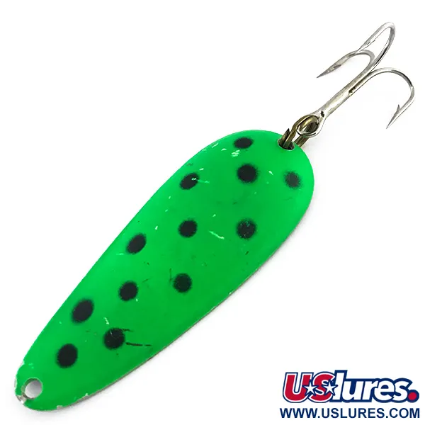 Salpicada de puntos negros sobre un acabado verde vibrante, esta pieza vintage destaca por su estética clásica de patrón de rana, muy apreciada por los pescadores de mediados de siglo. El peso de 16g (3/5oz) proporciona suficiente inercia para lanzamientos profundos en los bordes de la vegetación o para el curricán en los desniveles. Al dar la vuelta al señuelo, se descubre un reverso de níquel pulido que ofrece un destello metálico intenso en contraste con el frontal pintado. Fabricada en EE. UU. por Nebco con el código de producto 8841, la cucharilla presenta un perfil clásico en forma de lágrima de 7,5cm (3") de longitud. Se conserva en excelente estado con una calificación de 4/5, mostrando solo leves signos de edad en sus componentes metálicos. Un anzuelo triple grande y afilado está unido mediante una anilla abierta, lista para su exhibición en una caja de aparejos o para una jornada de pesca. La cabeza de la cucharilla incluye un único orificio limpio para asegurar el bajo de línea.