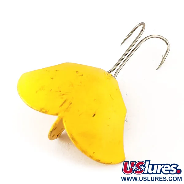 Un peso de 1/2 oz (14 g) le da a este pequeño señuelo metálico una densidad sorprendente para su cuerpo compacto de 1 1/2" (3,5 cm). Fabricado por Harrison Industries en USA, el Baby Bat, identificado con el código de producto 11186, presenta un diseño alado único troquelado en metal y acabado en un amarillo brillante sólido. Este ejemplar específico está en excelentes condiciones, con una calificación de 5/5, y la pintura conserva su brillo original en las alas anchas y la quilla central. El montaje incluye un anzuelo doble afilado hacia arriba en la parte trasera, una elección de diseño pensada para lanzar en zonas con riesgo de enganches. Al mirar de cerca la cresta superior, se aprecian pequeñas muescas intencionadas que añaden una textura técnica al cuerpo troquelado. El vibrante color amarillo proporciona un alto contraste, convirtiéndolo en un elemento destacado de la historia de los aparejos de pesca estadounidenses.