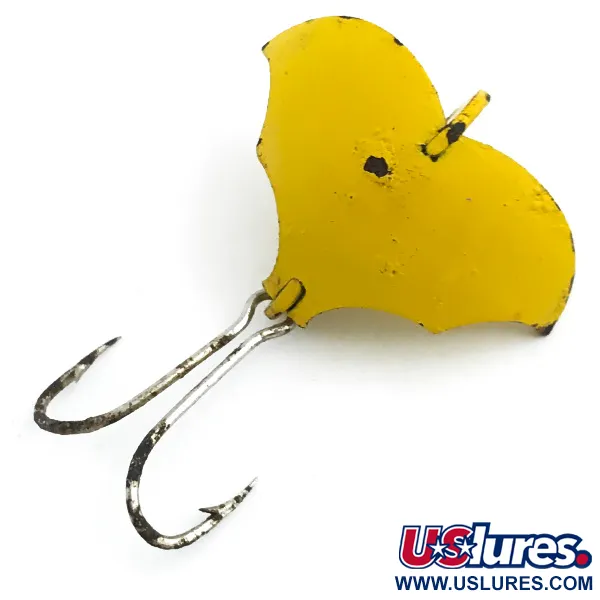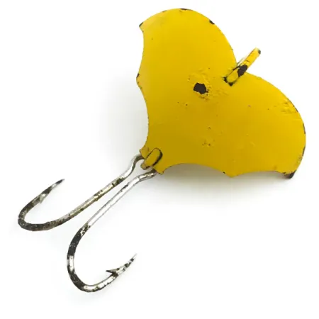Estampado en metal y acabado en un llamativo tono amarillo, este ejemplar de 5g (3/16oz) representa la filosofía de diseño única de la compañía Prescott Spinner. Con una medida exacta de 2,5 cm (1"), el Baby Bat presenta una configuración de tres alas que crea su silueta inconfundible. Este señuelo de fabricación estadounidense, con código de producto 5455, está equipado con un gran anzuelo doble montado en la parte inferior de la cola. Los coleccionistas valorarán su estado de 4/5, con pequeñas pérdidas de pintura en los bordes y a lo largo de la cresta central donde el metal queda a la vista. El ojal superior permanece despejado para el montaje, mientras que el esmalte amarillo conserva gran parte de su brillo original.