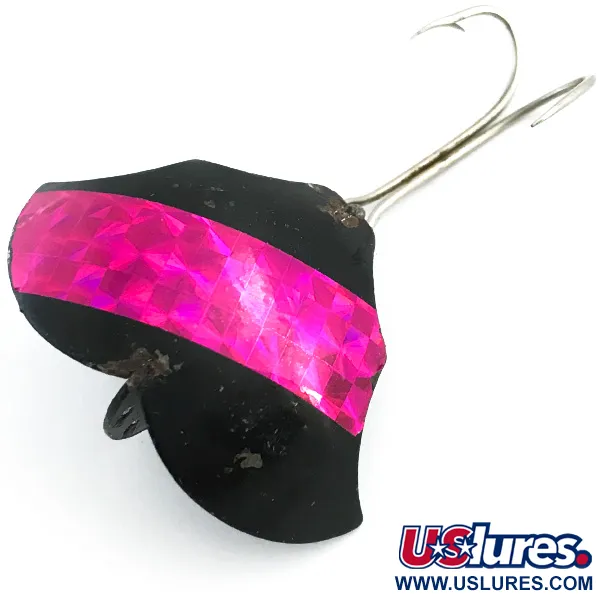 Con un peso de 14g (1/2 oz), el señuelo presenta un cuerpo compacto de 3,5 cm (1 1/2") que demuestra la ingeniería única de la Prescott Spinner Company. La superficie esmaltada en negro destaca por una amplia banda holográfica en rosa magenta, que proporciona un elemento reflectante de alto contraste sobre la base oscura. En el interior de la estructura en forma de ala, el nombre "Baby" está grabado directamente en el metal, identificando este modelo como Baby Bat bajo el código de producto 5456. Los componentes consisten en un robusto anzuelo doble sujeto a un lazo de alambre, un diseño pensado para la durabilidad manteniendo una sujeción segura. Fabricado en EE. UU., este ejemplar mantiene un estado 4/5, mostrando una pintura bien conservada y una aplicación holográfica limpia, con solo ligeros signos de antigüedad en la tija del anzuelo y en los bordes metálicos.