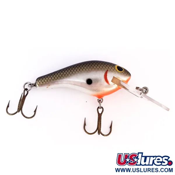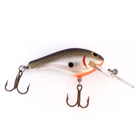 Construido en madera de balsa de primera calidad, este señuelo clásico pesa exactamente 12 g (2/5 oz). Su cuerpo de 6 cm (2 1/4") muestra un acabado shad meticulosamente aplicado, resaltado por un patrón de escamas en panal oscuro en el lomo y flancos plateados brillantes. Los detalles visuales incluyen un punto negro lateral marcado, una línea de agalla roja curva y una sección de la garganta en naranja brillante. Los ojos amarillos de gran tamaño con pupilas negras proporcionan un punto focal de alto contraste característico de la artesanía estadounidense de Bagley. Un babero grande y transparente está integrado en el morro, con una anilla abierta de fábrica para un montaje seguro. El equipo consta de dos anzuelos triples afilados en tono bronce. Manteniendo un alto nivel de conservación, este ejemplar está calificado con un 5/5 por su apariencia limpia y lustrosa. Este Bagley B2 en particular se identifica con el código de producto 10027.
