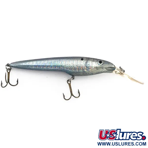 Con una longitud de 10 cm (4") y un peso de 14 g (1/2 oz), el perfil de este señuelo para aguas profundas muestra la artesanía clásica de Bagley de los EE. UU. El acabado es un distintivo Rainbow Silver, con un patrón de escamas holográficas que refleja tonos plateados, azules y púrpuras claros. Bajo el código de producto 8070, este señuelo BAGLEY Diving Bang-O es un modelo flotante diseñado para lanzamientos a profundidades de aproximadamente 3,6-4,5 m. El babero de plástico transparente de gran tamaño está asegurado con un anillo de sujeción metálico, construido para alcanzar coberturas profundas. Su montaje original consta de dos anzuelos triples en acabado oscuro. Con una calificación de estado de 5/5, el señuelo conserva su brillo original y su integridad estructural. El diseño se completa con ojos negros con borde plateado situados de forma prominente en la cabeza plateada.