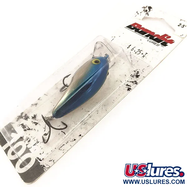 Con una longitud exacta de 5 cm (2"), este señuelo de poca profundidad es un básico para la pesca de lucioperca y lucio. El patrón de color presenta un lomo azul metálico que transiciona hacia unos costados cromados brillantes, rematado con un ojo amarillo intenso para un aspecto clásico. Calificado con un 6, el señuelo está sin usar y se conserva en su embalaje original con frontal transparente. Pesa 7 g (1/4 oz) y está diseñado para profundizar entre 0,6 y 1,5 m (2-5 ft) durante el lanzado o el curricán. Fabricado en Guatemala, este Bandit 100 específico (Código 12899) mantiene el legado de las primeras producciones de la marca. El vientre y la cola están equipados con poteras negras afiladas que no muestran signos de deterioro.