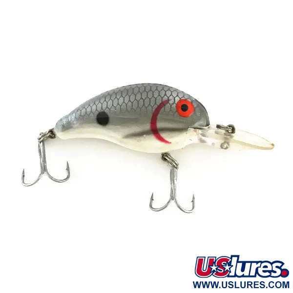 Con una longitud de 5 cm (2"), el cuerpo de escamas plateadas de este Bandit 200 luce un arco branquial rojo de alto contraste y ojos rojos a juego. Este crankbait flotante de 8,5 g (1/3 oz), identificado con el código de producto 8162, está diseñado para alcanzar profundidades de hasta 3 m (9,8 ft) en lances o curricán para lucioperca y lucio. Su vientre blanco perlado pasa a un lomo de escamas grises, marcado a mitad de camino por una sola mota negra para imitar los patrones de los peces pasto comunes. Este ejemplar se encuentra en un estado 5/5, manteniendo los herrajes limpios y su babero transparente original. En el interior del cuerpo, un mecanismo de sonajero proporciona un elemento auditivo durante la recogida. Los anzuelos están afilados y son originales, reflejando la artesanía de estos señuelos fabricados en USA.