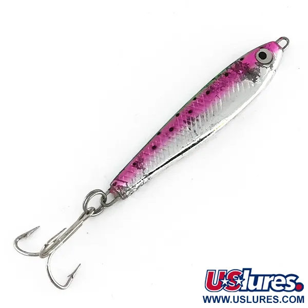 Con un peso de 17 g (3/5 oz), este jig metálico ofrece la densidad necesaria para lances de precisión o jigging vertical en aguas profundas. Bass Pro Shops fabricó este modelo específico, catalogado con el código 8244, con una longitud de 6 cm (2 1/4"). El esquema de color Trout es especialmente llamativo, combinando un flanco rosa brillante con una base de cromo plateado y sutiles reflejos verdes en el lomo. Pequeños puntos negros motean la sección rosa para imitar las marcas naturales de las presas. Un anzuelo triple plateado clásico está sujeto a la parte posterior con un robusto anilla de llavero, asegurando clavadas fiables. Este señuelo se encuentra en un estado 5/5, con una superficie reflectante impecable y sin oxidación visible en los herrajes. Su perfil estrecho y aerodinámico es característico de los jigs norteamericanos de finales del siglo XX, optimizado para minimizar la resistencia al agua durante el hundimiento.