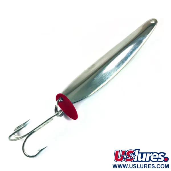 Un peso de 1 oz (28 g) convierte a este jig vertical en una opción formidable para alcanzar rápidamente la profundidad en corrientes fuertes o cuencas profundas de lagos. Identificado con el código de producto 1727, este Bay de Noc Swedish Pimple luce un acabado Níquel / Blanco / Rojo, donde el cuerpo de níquel pulido se complementa con un inserto de cinta reflectante blanca. Este espécimen mide 3 1/4" (8 cm) y se mantiene en un estado impecable 5/5, con una superficie reflectante perfecta y un anzuelo triple firme. En el anilla abierta inferior se encuentra la característica hoja de atracción de plástico rojo, una seña de identidad del diseño Swedish Pimple utilizada para crear un punto de mira para las picadas. Un ojo facetado en tonos magenta está incrustado cerca de la cola, proporcionando un punto adicional de contraste visual. Este señuelo es un clásico de la historia de los aparejos estadounidenses, diseñado específicamente para el jigging vertical a través del hielo o en aguas abiertas.