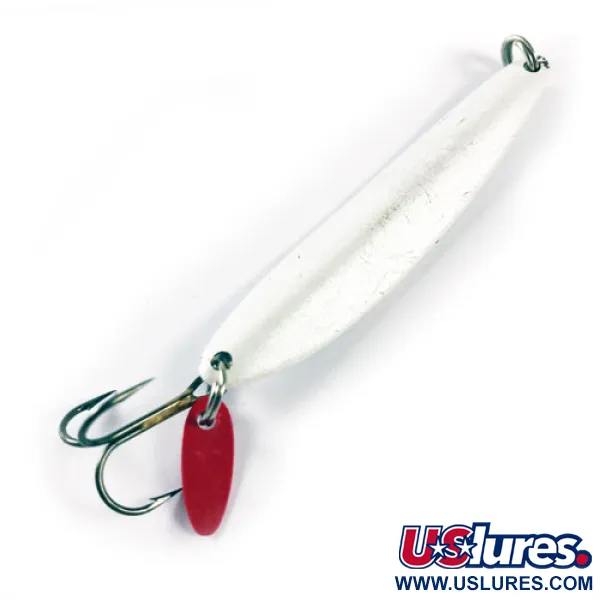 El pigmento blanco perla cubre este espécimen de 21 g (3/4 oz), una elección de peso equilibrada específicamente para el jigging en aguas profundas o para atravesar corrientes rápidas. Con 7 cm (2 3/4 pulgadas) de largo, el Bay de Noc Swedish Pimple presenta un perfil curvo y delgado diseñado para presentaciones verticales tanto en aguas abiertas como en pesca en hielo. Esta unidad, identificada por el código de producto 1728, conserva su icónica aleta roja de plástico en la cola para proporcionar un punto de ataque visual para los depredadores. El acabado muestra un desgaste superficial muy leve de su tiempo en la caja de pesca, lo que le otorga una calificación de estado de 4/5. Anillas abiertas de alta resistencia están montadas en ambos extremos, asegurando el hardware para especies como la lucioperca, la trucha de lago o el lucio. El diseño refleja décadas de artesanía de Bay de Noc Lure Co., con sede en Michigan, enfatizando la utilidad y componentes simples y efectivos sobre mecánicas complejas.