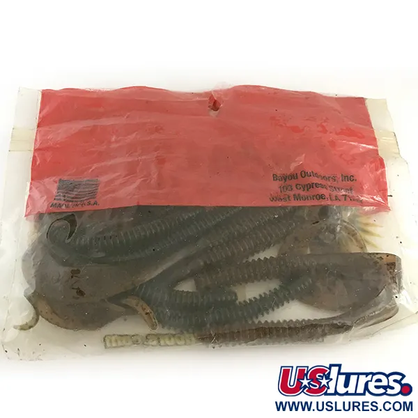 Los anillos fuertemente texturizados a lo largo del cuerpo de 4" (10 cm) de estos vinilos son una característica definitoria de la serie V&M "Ultimate Bassin' Bait" de Bayou Outdoors. Este lote específico, con el código de producto 6669, incluye 11 piezas de plástico blando fabricado en EE. UU. en el clásico color Green Pumpkin. Impregnados con un perfil de aroma que destaca la técnica "pork fat cooked in" de la marca, estos señuelos mantienen su flexibilidad original. El diseño de cola rizada (curly tail) unido al torso acanalado proporciona un contraste visual con las escamas oscuras incrustadas en el plástico verde translúcido. Aunque la bolsa original está abierta y muestra desgaste por almacenamiento, los señuelos están sin usar.