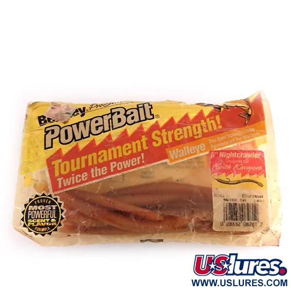 Diseñados por el legendario profesional del walleye Keith Kavajecz, estos Berkley PowerBait Nightcrawlers de 15,2 cm (6 pulgadas) cuentan con la clásica punta de la cola en chartreuse que proporciona un estímulo visual en aguas turbias. Este paquete, catalogado bajo el código de producto 9620, proviene de la era "Tournament Strength", con una fórmula de aroma y sabor infundida promocionada por tener el "doble de potencia" para la pesca de competición. Quedan siete vinilos del paquete original de diez unidades, manteniendo todos su textura flexible y el distintivo perfil de color Chartreuse que transita de un cuerpo marrón natural a un extremo amarillo-verde brillante. El diseño imita la anatomía segmentada de una lombriz de tierra real, un sello distintivo del compromiso de la línea PowerBait con la textura y el realismo. Fabricados en EE. UU., estos plásticos están en condición 5/5 y aún conservan la potente fórmula de aroma anunciada de forma destacada en el envase vintage amarillo y rojo. Este modelo 9620 fue una pieza fundamental del equipo específico para la lucioperca americana utilizado durante el auge de los circuitos profesionales.