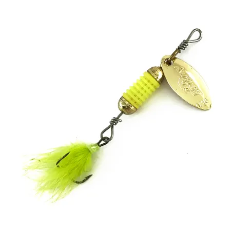 Un estriado chartreuse vibrante define el cuerpo central de esta cucharilla vintage, un diseño pensado para retener atrayentes líquidos. Con un peso de 2,5 g (3/32 oz), esta pieza cuenta con una hoja dorada pulida grabada con el nombre del fabricante, lo que genera un destello metálico clásico durante la recogida constante. Con una longitud de 5,5 cm (2 1/4"), el señuelo está rematado con un anzuelo triple de plumas chartreuse a juego que aporta un perfil suave y natural a la presentación. Este modelo, código 8185, emplea un eje de alambre pasante con cierres de seguridad profesionales tanto en el ojo del sedal como en el del anzuelo. La hoja de lágrima en acabado dorado está equilibrada por topes de color latón que cierran la cámara de difusión de aroma, destacando la innovación de Berkley en aquella época. Cada componente, desde las superficies metálicas hasta el delicado plumaje, está en excelente estado (puntuación 5/5).