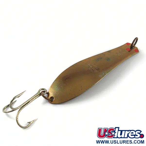 El nombre "BIG DOCTOR 285" está claramente grabado en el cuerpo de latón, identificando esta cucharilla ondulante de alta resistencia de la empresa Prescott Spinner de Wisconsin. Con un peso sustancial de 30 g (1 oz) y una longitud de 11 cm (4 1/4"), este señuelo fabricado en EE. UU. está diseñado para alcanzar capas de agua más profundas durante el lanzado o el curricán. El acabado Bronce (Latón) tiene un aspecto suave y envejecido, acentuado por tres puntos rojos distintivos cerca del anillo de sujeción que sirven como un punto focal visual clásico. Un gran anzuelo triple está conectado mediante un resistente anilla abierta en la base, proporcionando una conexión sólida para especies pesadas de agua dulce. Este ejemplar, identificado con el código de producto 2903, se encuentra en un estado 4/5, mostrando ligeras señales de su historia pero permaneciendo totalmente funcional y robusto. Su construcción es típica de la era de mediados de siglo de la producción estadounidense de señuelos metálicos fiables, con la ubicación del fabricante también grabada en la superficie metálica.