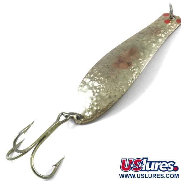 Con un peso de 1 oz (30 g), esta cucharilla exhibe el raro acabado 'Crystal', un patrón martillado diseñado para imitar el brillo del cristal roto bajo la superficie. El Prescott Spinner Big Doctor 285, identificado con el código de producto 3173, tiene una longitud de 4 1/4" (11 cm) y conserva su perfil clásico de fabricación estadounidense. Pequeños puntos rojos decorativos están situados cerca del ojal, añadiendo un sutil toque de color al cuerpo de metal texturizado. Esta pieza vintage se encuentra en una condición 4/5, lo que refleja una historia bien conservada con un ligero desgaste superficial propio de su antigüedad. Los componentes originales, incluyendo el anzuelo triple y las anillas abiertas, permanecen intactos y seguros para lances o curricán.