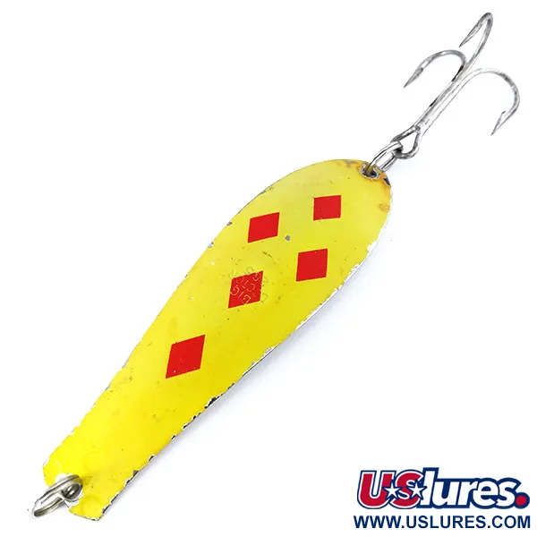 Cinco diamantes rojos contrastan fuertemente con la base amarillo brillante de esta clásica cucharilla ondulante de fabricación estadounidense. Con un peso de 28g (1oz) y una longitud de 11cm (4 1/4"), la Prescott Spinner Big Doctor 285 UV sigue siendo una opción sólida para los pescadores que buscan grandes depredadores mediante lanzado o curricán. Este ejemplar, con el código de producto 10718, tiene una calificación de estado de 4/5, mostrando ligeros signos de su edad pero conservando un acabado vibrante de alta visibilidad. El aspecto técnico más llamativo es la propiedad fluorescente de la pintura amarilla; bajo la luz ultravioleta, el cuerpo del señuelo emite un fuerte brillo verde, dejando las marcas de los diamantes rojos como siluetas oscuras de alto contrato. Un detalle sutil se encuentra en el diamante central, donde el nombre "Big Doctor" está grabado directamente en el metal. El señuelo está acabado con un anzuelo triple reforzado y anillas abiertas originales, listo para ser exhibido o para volver al agua.