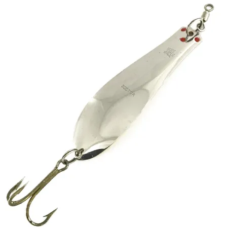 Con un peso considerable de 30g (1oz), esta cucharilla ondulante es perfecta para buscar depredadores en aguas profundas. Con una longitud de 11cm (4 1/4"), presenta una estética de dos tonos con una cara de plata pulida y un reverso en tono dorado. Pequeños detalles en rojo cerca del ojal superior aportan un destello de color sobre el cuerpo metálico brillante. En el lado plateado aparece grabada la marca "DOCTOR", que identifica este modelo con el código de producto 7110. Esta cucharilla fabricada en USA está equipada con un anzuelo triple de alta resistencia y un esmerillón de giro suave unido mediante anillas abiertas reforzadas. La unidad se encuentra en estado 5/5, manteniendo el acabado de alto brillo original en ambas caras. Su estructura de metal grueso está diseñada para lanzados pesados o pesca al curricán de grandes peces de agua dulce.