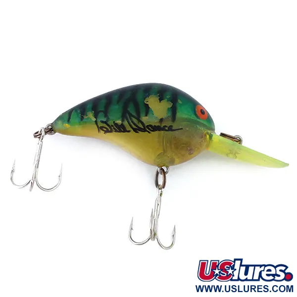 Con una longitud de 2 1/4" (6 cm), el Bill Dance Signature Bomber Fat A luce el nombre del legendario pescador en letras negras sobre su acabado de rayas verdes y amarillas. Este señuelo con sonajero de 18 g (2/3 oz), con código de producto 10903, está diseñado para ser suspending, manteniéndose estático en la columna de agua cuando se recupera a profundidades de 2,9 - 3,6 m (9,5 - 11,8 ft). Un gran babero amarillo translúcido se extiende desde el frente, diseñado tanto para lances como para curricán buscando black bass, lucioperca y lucio. En el exterior, el señuelo cuenta con vibrantes ojos rojos y anzuelos triples en tonos plateados. El estado general es 4/5, mostrando algo de pérdida de pintura en la parte superior del lomo y el hombro, mientras que el resto del acabado permanece brillante. Fue fabricado en EE. UU. como una herramienta de profundidad para diversas especies de agua dulce.