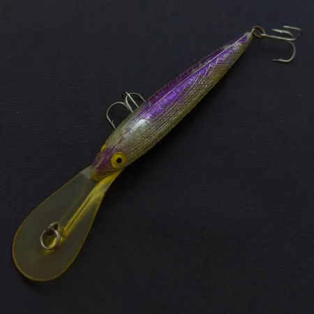 El babero largo amarillo translúcido de este minnow de 9 cm (3 1/2") permite alcanzar profundidades de hasta 5 m (16 pies). El Deep Shiner Minnow es un señuelo suspending, diseñado por Bill Norman para buscar peces en las capas profundas. Un vibrante acabado plata/púrpura cubre el cuerpo con patrón de escamas, reflejando la luz a través del plástico transparente. Con 9 g (1/3 oz), tiene masa suficiente para lances efectivos y es igualmente apto para curricán. Identificado con el código 24566, presenta ojos amarillos pintados y mantiene un aspecto impecable calificado como 4/5. El babero de profundidad está integrado en la cabeza para facilitar una recogida constante o una técnica de stop-and-go.