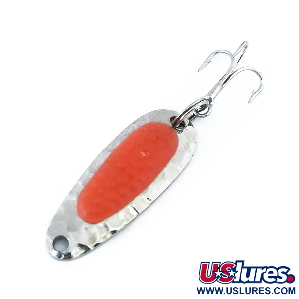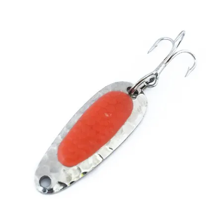 El níquel martilleado genera destellos intensos en esta cucharilla compacta de latón pesado de 3,5 cm (1 1/2"). Con un peso de 4,5 g (3/16 oz), la Blue Fox Pixee UV cuenta con un perfil clásico de lágrima diseñado para aguantar corrientes fuertes de río o pozas profundas. El rasgo distintivo de este modelo, código 11006, es el inserto rojo central que imita un huevo de salmón. Este elemento fluorescente reacciona a la luz UV, ofreciendo un blanco visual brillante en aguas de poca visibilidad. Blue Fox fabricó este señuelo con peso suficiente para lances largos incluso con viento costero. Se encuentra en excelente estado, con acabado brillante y herrajes intactos (puntuación 5/5). Monta un anzuelo triple afilado en la anilla abierta trasera, listo para pescar truchas, salmones o lubinas.