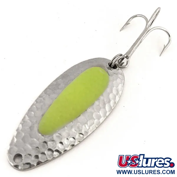 Con una longitud de 6,5 cm (2 1/2 pulgadas), el cuerpo de latón de gran espesor de esta cucharilla está fabricado para cortar los vientos costeros y alcanzar las pozas profundas donde suelen encontrarse los salmones y las truchas steelhead. El acabado en níquel martilleado proporciona una superficie texturizada que capta y dispersa la luz, mientras que el inserto central de color amarillo vibrante, que simula un huevo de salmón, está diseñado con un brillo UV para mantener la visibilidad en aguas turbias o con poca luz. Con el código de producto 12701, este señuelo de 24 g (3/4 oz) no muestra signos de desgaste y mantiene una calificación de estado de 5/5. Originalmente parte de la línea National Expert Bait (NEBCO) antes de la transición de la marca a Blue Fox, este modelo específico cuenta con un anzuelo triple de alta calidad unido mediante un robusto anilllo abierto. Es una opción eficaz tanto para el lanzado en fuertes corrientes de río como para el curricán en aguas abiertas, donde su densidad permite una presentación profunda. El borde frontal presenta un punto de enganche limpio, diseñado para su uso con un esmerillón con broche para facilitar un movimiento de balanceo natural durante la recogida.