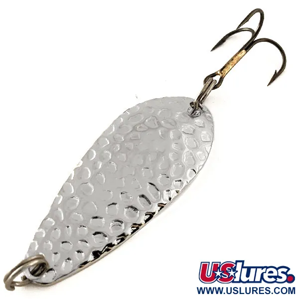 La textura de níquel martilleado define la cara de esta cucharilla Blue Fox Strobe, ofreciendo una estética clásica que sigue siendo un elemento básico para muchos pescadores. Identificado por el código de producto 11867, el señuelo pesa 2/5 oz (11g) y tiene una longitud total de 2 1/4" (5,5 cm). Este ejemplar mantiene una calificación de estado de 6, con las superficies metálicas y los componentes apareciendo como recién salidos de fábrica. El reverso lleva estampado el sello Blue Fox y el peso, reflejando su origen en USA. Un anzuelo triple estándar está unido a la cola mediante un anilla abierta, lo que garantiza que el señuelo esté funcionalmente completo y listo para el lanzado o curricán.
