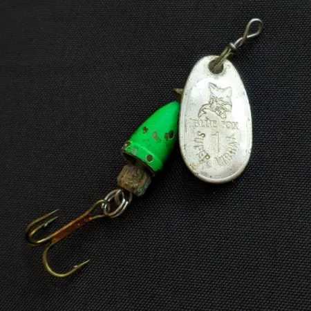 Con el icónico logotipo del zorro claramente grabado, la pala con acabado plateado de esta cucharilla giratoria de tamaño 1 resalta su herencia mediante la inscripción "Made in Finland" en la parte posterior. Con un peso de 1/8 oz (4 g), esta Blue Fox Super Vibrax 1 utiliza la clásica construcción de cuerpo de campana en dos partes. El acabado pintado en verde del componente interno muestra un desgaste natural, lo que le otorga una calificación de estado de 4/5 conservando su encanto vintage. Identificado con el código de producto 18815, el señuelo está montado con un anzuelo triple robusto y espaciadores de color latón a lo largo del eje de alambre. El estampado en la cara de la pala es nítido, mostrando claramente el nombre de la marca junto con la designación del tamaño. Pequeñas manchas en la sección de la campana verde muestran dónde la pintura se ha desgastado con los años, revelando la base metálica.