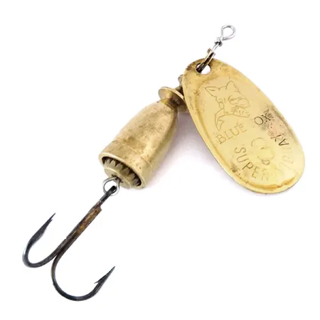 Claramente estampada en la parte inferior de la hoja de latón se encuentra la marca de origen "MADE IN FRANCE", un sello distintivo de las primeras series de producción de esta cucharilla de 6 cm (2 1/4"). El peso de 8 g (1/4 oz) está centrado en el distintivo cuerpo de latón de dos partes, que cuenta con la característica campana interior dentada diseñada para interactuar con la carcasa exterior. Este espécimen en particular, identificado con el código de producto 10514, muestra un acabado de latón consistente tanto en la hoja en forma de lágrima como en la campana contrapesada. La cara de la hoja está decorada con un emblema de cabeza de zorro en relieve y la marca Super Vibrax, mientras que el reverso incluye el sello US PAT. 4163336. Con una calificación de estado de 4/5, los componentes metálicos exhiben un brillo suave y limpio por el paso del tiempo, manteniendo el herraje y el eje de alambre rectos y funcionales. Un robusto anzuelo triple está sujeto a la parte trasera, listo para el agua. El diseño interno de la campana es una característica técnica diseñada específicamente para minimizar la torsión de la línea durante el uso, reflejando la precisión de la fabricación francesa de esta época.