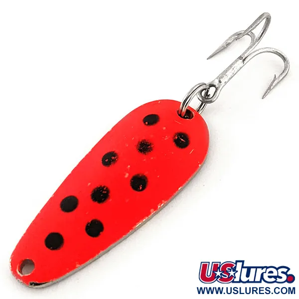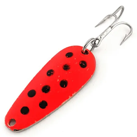 Con un peso de 1/2 oz (14 g), el perfil de lágrima de esta cucharilla Blue Fox fabricada en Estados Unidos está diseñado para lances eficientes. Con una longitud exacta de 2" (5 cm), el modelo Tor-P-Do UV, identificado con el código de producto 12795, presenta una cara roja de alto contraste con puntos negros sobre un dorso niquelado. El principal atractivo técnico de este ejemplar reside en su recubrimiento fluorescente reactivo a los rayos UV, que reacciona a la luz ultravioleta para proporcionar visibilidad en aguas turbias o en situaciones de poca luz. Una robusta anilla abierta conecta el cuerpo a una potera de níquel pulido, garantizando una conexión segura. Cada detalle, desde el impecable acabado de pintura hasta los herrajes, refleja su excelente estado 5/5. Su diseño sencillo permite una variedad de profundidades de presentación, aprovechando su peso elevado para su tamaño para descender rápidamente. Un orificio pretaladrado en la cabeza proporciona un punto de enganche sólido para nudos directos o imperdibles de pesca.