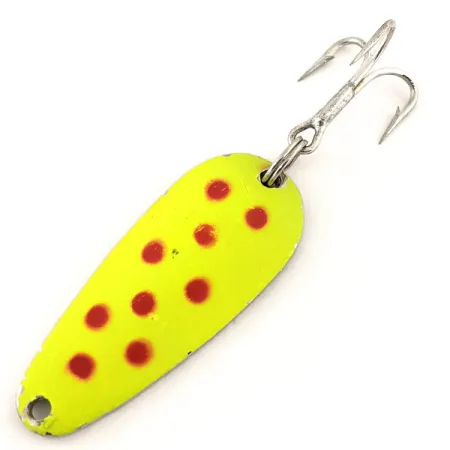 Revestida con una vibrante pintura chartreuse y puntos rojos distintivos, esta cucharilla de fabricación estadounidense está diseñada para una alta visibilidad en diversas condiciones de claridad del agua. En estado sin usar (calificación 6), el acabado se mantiene nítido y reflectante en todo su perfil de 5 cm (2"). Mientras que el chartreuse fluorescente destaca a plena luz del día, la utilidad específica de esta Blue Fox Tor-P-Do UV proviene de su revestimiento reactivo que brilla intensamente bajo luz UV, haciendo que los puntos rojos parezcan puntos de ataque oscuros y de alto contraste. Un robusto anzuelo triple está asegurado por una anilla abierta resistente a la parte inferior niquelada y pulida, lo que contribuye a un peso total de 14 g (1/2 oz) para un lance efectivo o jigging vertical. Con el código de producto 12796, este señuelo utiliza su forma de lágrima y su cuerpo lastrado para mantener la estabilidad cuando se pesca al curricán en profundidad.