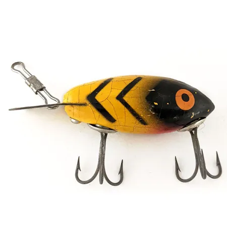 Este cuerpo de madera está revestido con una pintura amarilla decorada con distintivos chevrones negros, reflejando una época clásica de la producción de señuelos en Estados Unidos. Con una longitud de 6 cm (2 1/4") y un peso de 7 g (1/4 oz), este modelo de Bomber cuenta con el código de producto 12475 y pertenece al periodo de fabricación entre 1949 y 1970. El acabado muestra un craquelado fino y visible en las secciones amarillas y negras, lo que le confiere una calificación de estado de 4/5 conservando su auténtica estética vintage. Un llamativo ojo naranja con centro negro destaca sobre la sección de la cabeza pintada en color oscuro, creando un punto de atracción de alto contraste para depredadores como el lucio, la perca y el aspio. Este señuelo flotante está diseñado para profundizar hasta los 2,0 m (6,5 pies) durante la recogida. Su montaje consta de dos anzuelos triples en el vientre y un sistema metálico para la sujeción de la línea fijado en la parte posterior.